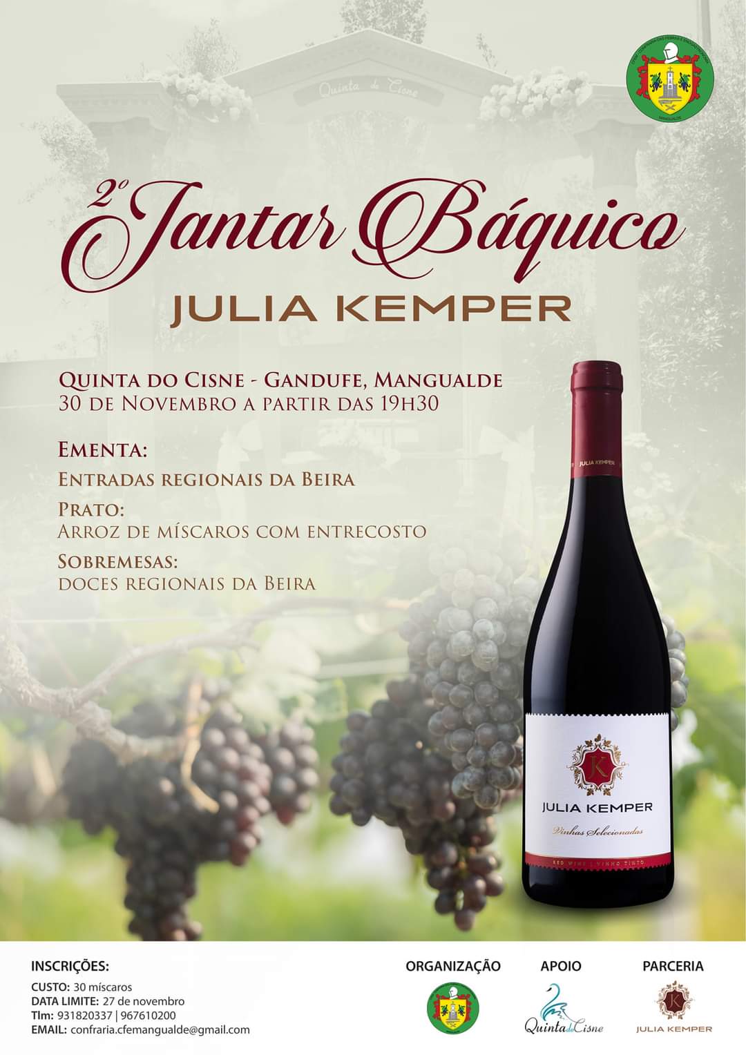 Estamos de coração cheio por ter recebido esta espetacular experiência! A Quinta do Cisne recebeu esta quinta feira, 30 de Novembro, o Jantar Báquico - Julia Kemper, organizado pela CFEM - Confraria das Febras e Enogastronomia de Mangualde. Um jantar acolhedor que contou com uma saborosa ementa: entradas regionais da Beira, como prato principal Arroz de Míscaros com Entrecosto e de sobremesa Doces Regionais da Beira. Um especial agradecimento à Julia Kemper Wines e à CFEM por terem escolhido a nossa Quinta para a realização deste jantar tão especial!